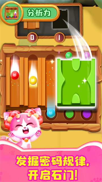 接下来和猫精灵探索地下宫殿吧。石门紧闭,宝宝仔细看门上的机关锁,依据小球的颜色,放置石板轨道,让小球通过轨道,滑落至对应颜色的容器中。瞧,石门自动开启!