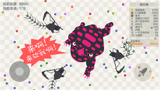 《五毒大作战正版》是一款经典的贪吃蛇玩法手游,但加入了更多有趣的元素。玩家通过吃地图上的小点或昆虫来让自己的蛇长大,不过和传统贪吃蛇不同的是,这里不用担心撞到自己,反而要小心其他玩家的围堵!如果被其他蛇碰到头部,你的蛇就会化为养分给对方。游戏中还加入了蜘蛛、蛤蟆、死神等多种玩法,玩家可以收集能量变身成这些毒物,在战场上横冲直撞。