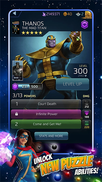4、可以释放相对应的人物技能,不同的搭配能打出不同的游玩体验,在消除玩法上,增加了收集角色和卡牌的新颖玩法,让漫威迷们对这款游戏起到非常大的兴趣。