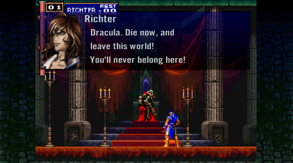 游戏开场就是前作《恶魔城X:血之轮回》的结尾,此时将控制里希特杀入恶魔城最上部的王座之间。与德古拉战斗时若失败,年幼的玛丽亚会即时赶到,并召唤出四圣兽让里希特变成无敌状态,打败德古拉后进入正题。
