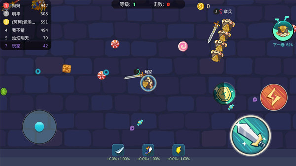 这款《刀剑大作战》手游看起来挺有意思的,玩法类似于“吃球”类游戏,通过吃掉地图上的点数来升级自己,同时得注意别被其他玩家攻击。游戏里的角色可以通过金币合成和升级,每次升级后角色和武器都会变得更强大,这样就能更容易击败敌人了。