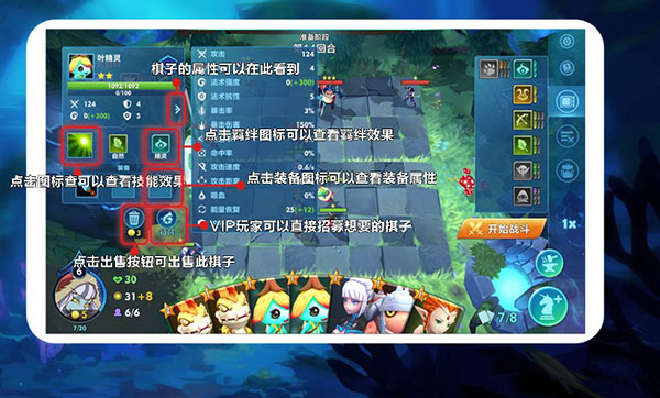 3、点击卡牌即可查看棋子的属性,点击技能可以查看技能的效果,点击羁绊图标可以查看羁绊效果,点击装备图标可以查看装备属性,VIP玩家可以直接招幕想要的棋子,点击出售按钮可出售此棋子。