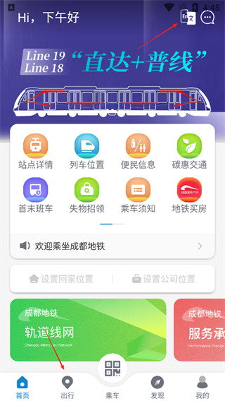 1、打开成都地铁官方版软件,右上角可以设置成中文,点击出行板块