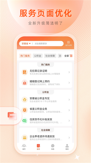 皖事通App是一款是安徽推广移动政务服务平台。提供社保、医保、公积金、公安户政、交通出行等千余项服务,让个人档案“随身携带”、电子证照“一键出示”、高频服务“极简办成”,打造全天候、一站式的政务服务好帮手!即刻下载,暖心服务触手可及。