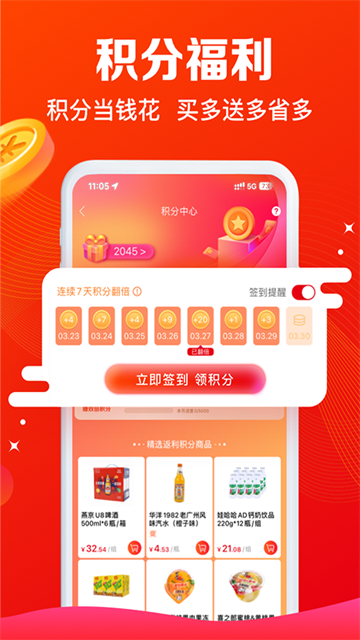 购物即返积分,满一定金额可享多倍积分,积分可抵现金、兑换优惠券。