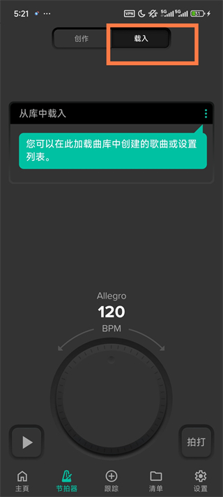 6、还可以在载入界面加载在库中所创建的歌曲或曲目。