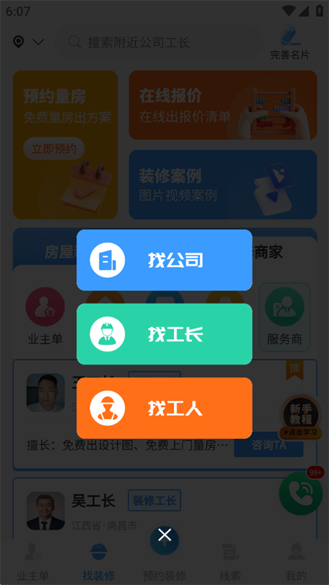 如果用户是业主,可以在这里发布任务寻找合适的装修师傅