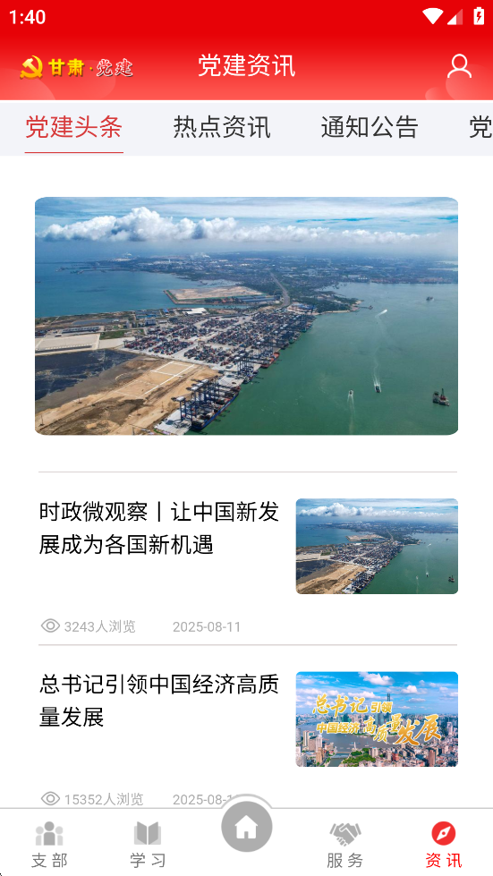 5、来到资讯界面,可以查看一些党建头条、热点资讯、通知公告等。