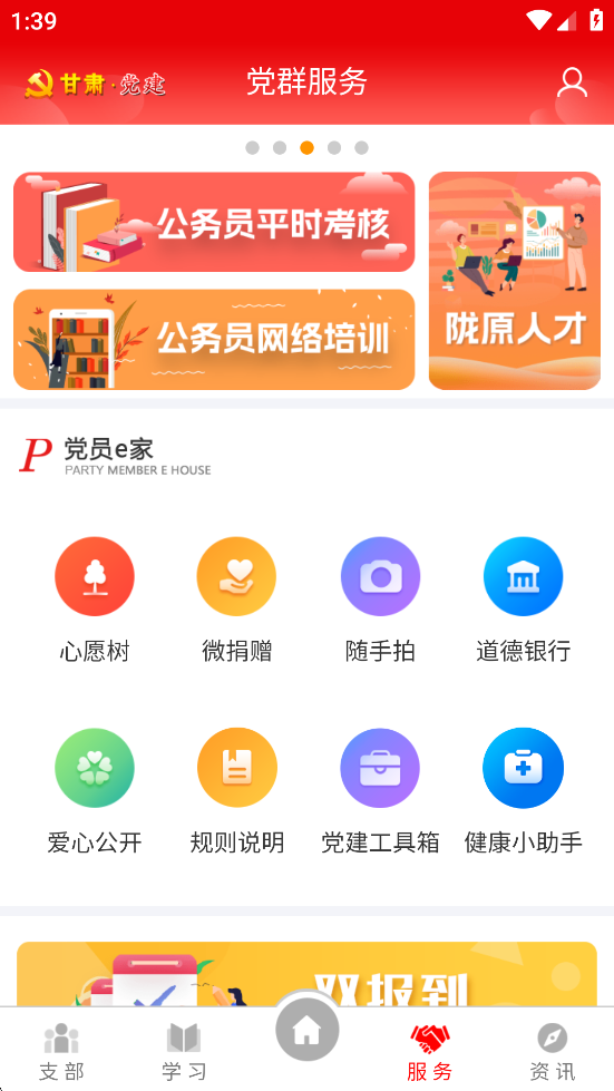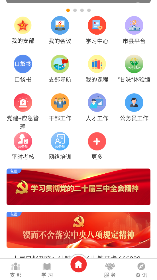 1、打开甘肃党建App,进入到主页界面,在这里我们可以看到一些日常功能,我的支部、我的会议、学习中心、市县平台等功能;