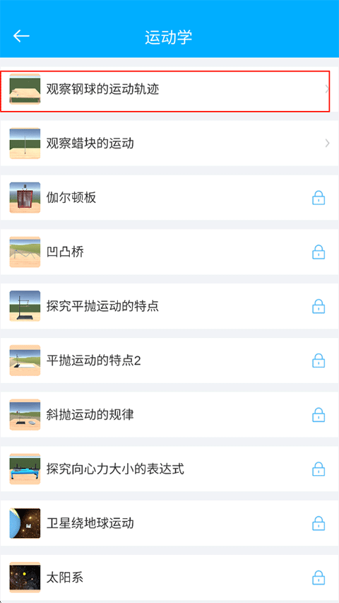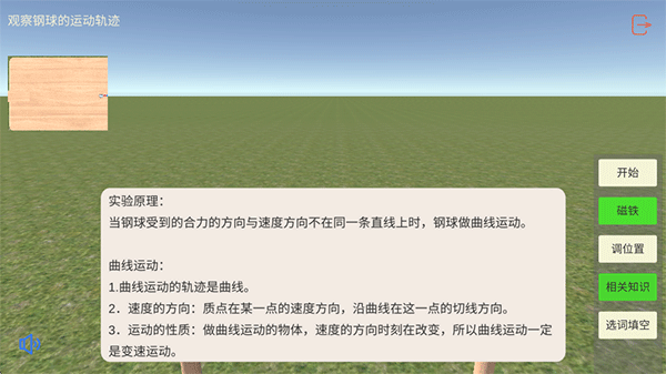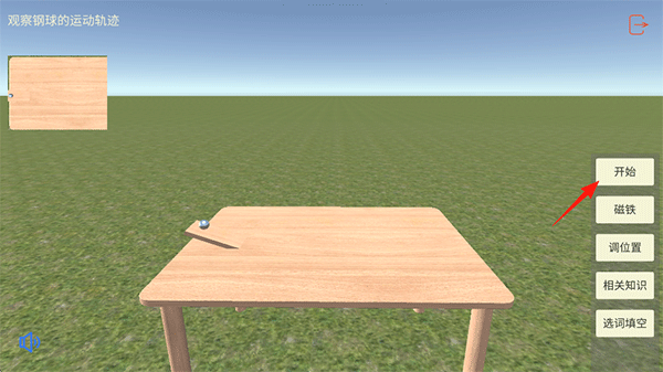 4、进入实验观察钢球的运动轨迹,点击开始,钢球将向下滚动;