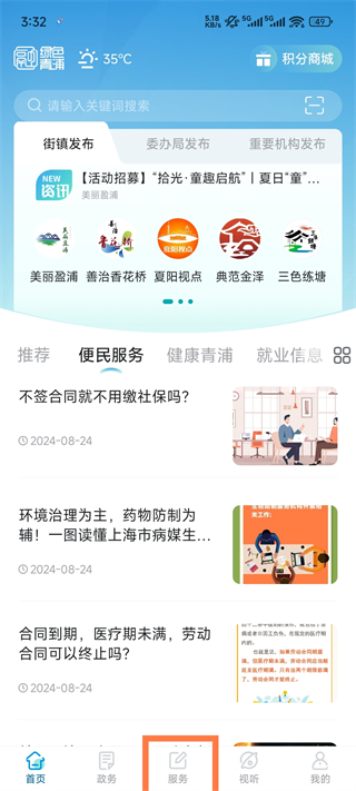 1、打开绿色青浦App在首页可以看到一些资讯,点击服务板块