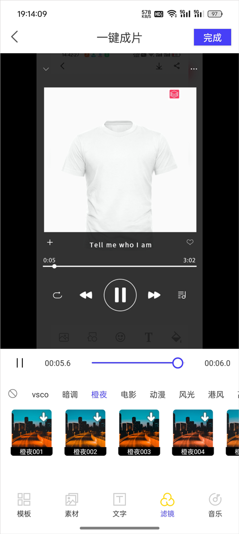 3、进入一键成片操作页面,可以在下方选择模板、素材、文字、滤镜等工具;点击【模板】,就可以在系统提供的多种视频模板中,选择自己喜欢的模板即可;