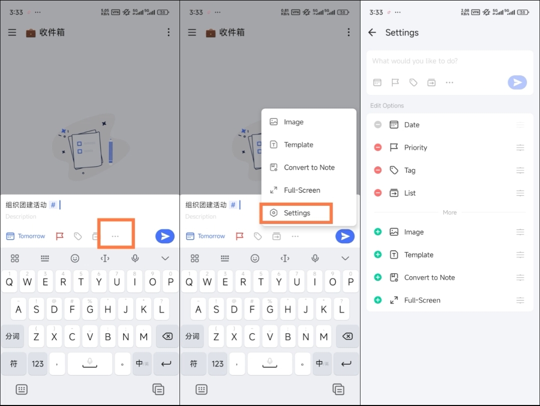 添加任务时底部功能栏的顺序支持自定义,点击「...」-「设置」,快速设置你的常用功能。