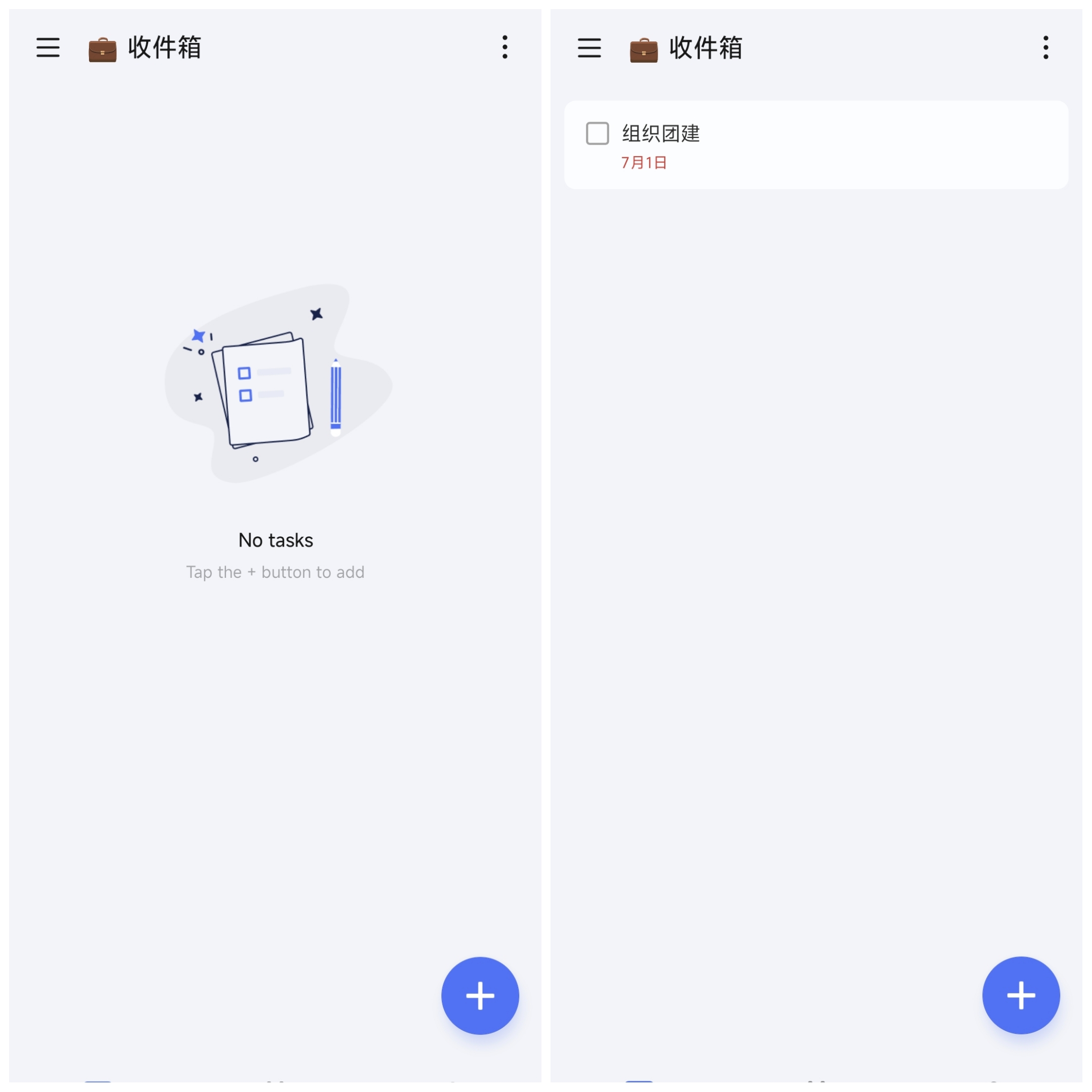 点击随处可见的「+」,输入任务后,点击「完成」图标,即可轻松创建任务。