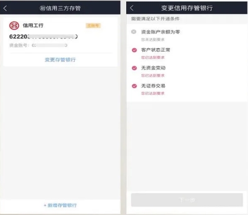 【融资融券】-【信用存管银行添加变更】投资者如需变更绑定融资融券账户的三方存管银行,可通过该菜单直接办理。