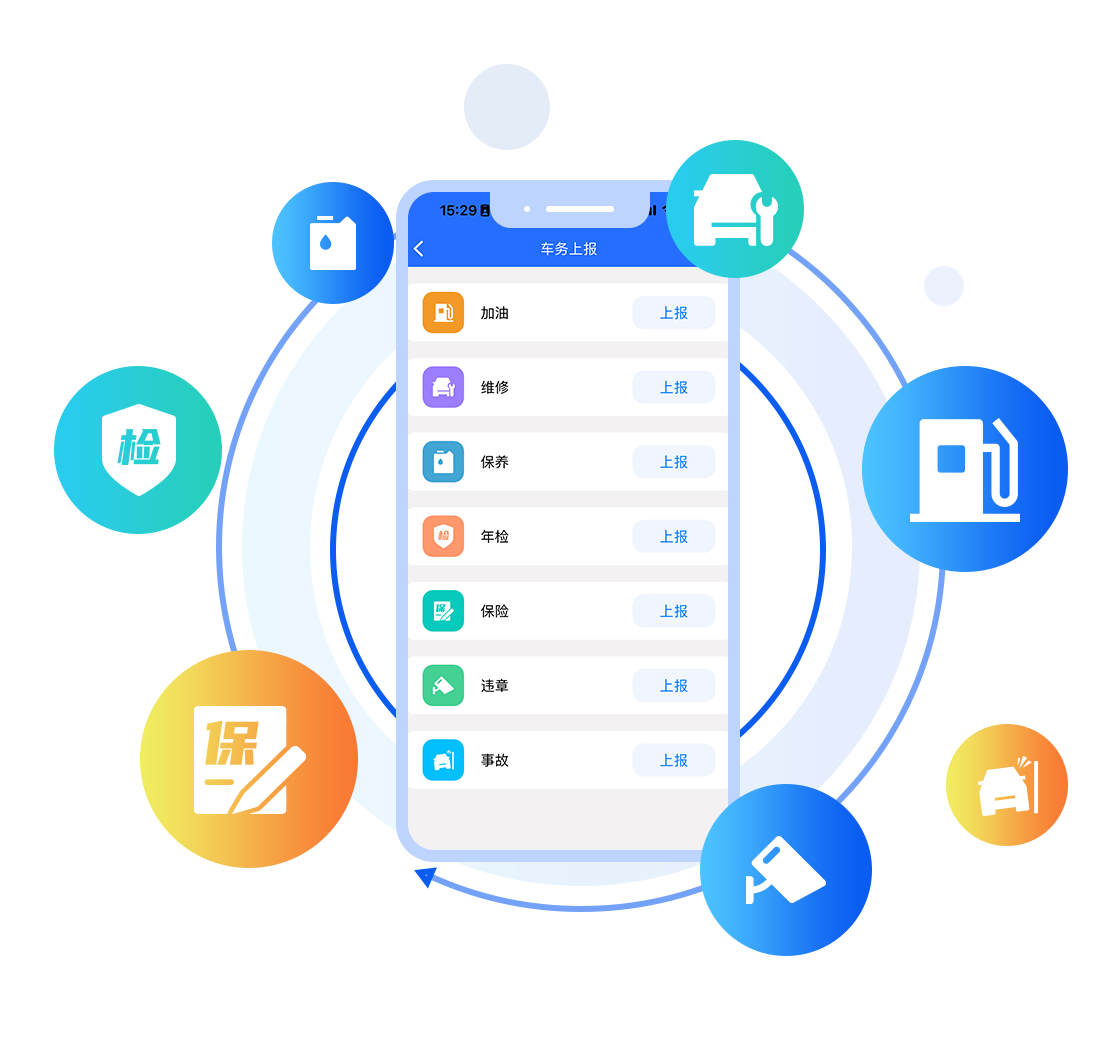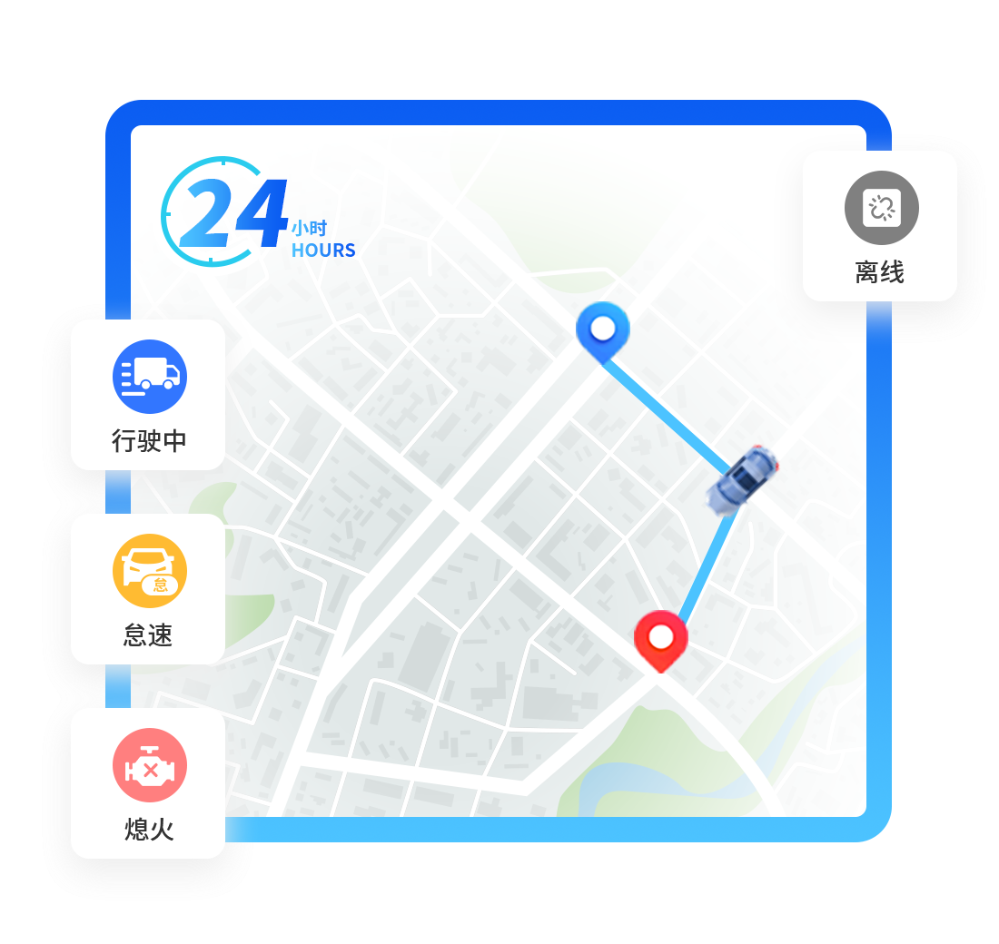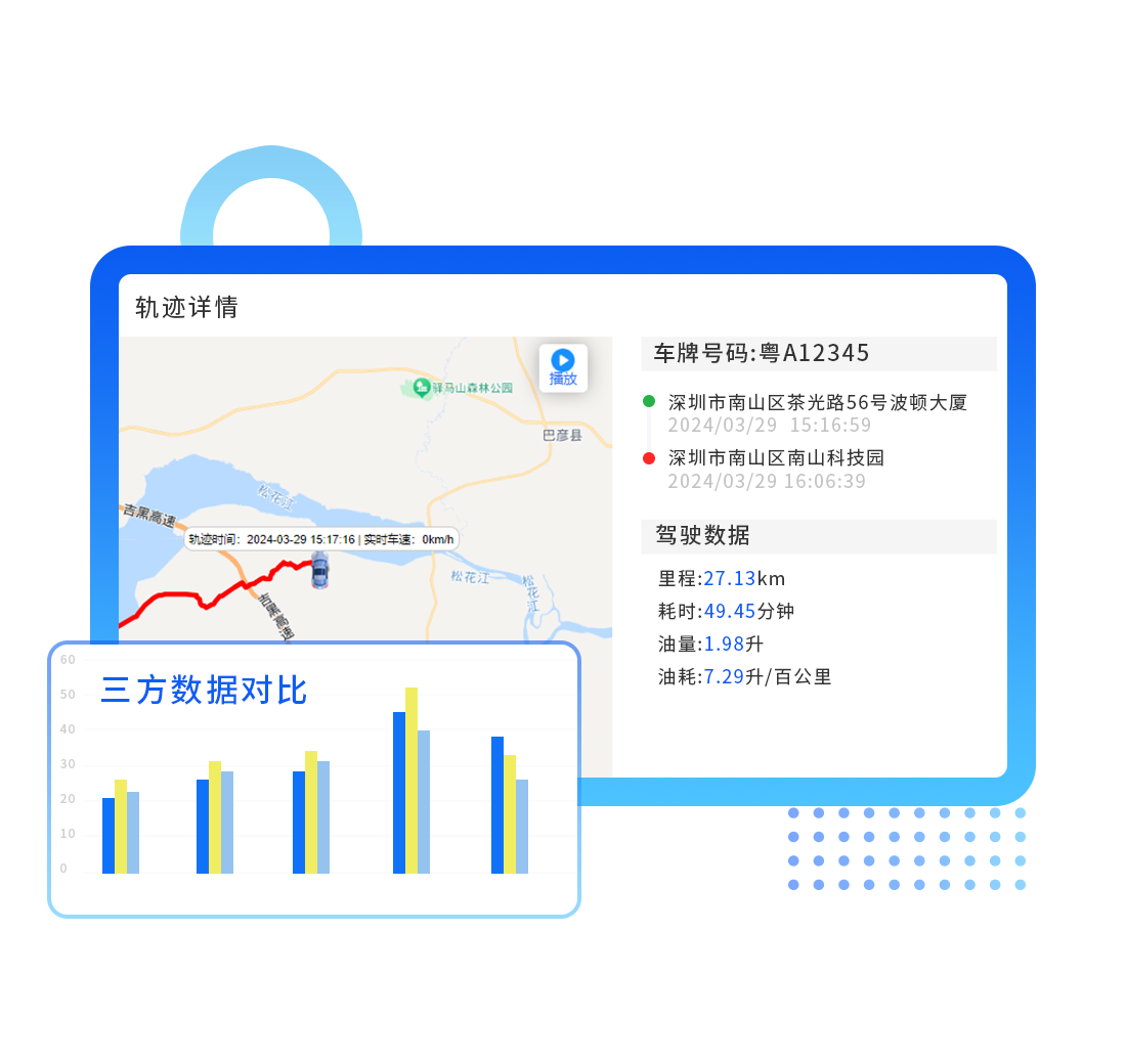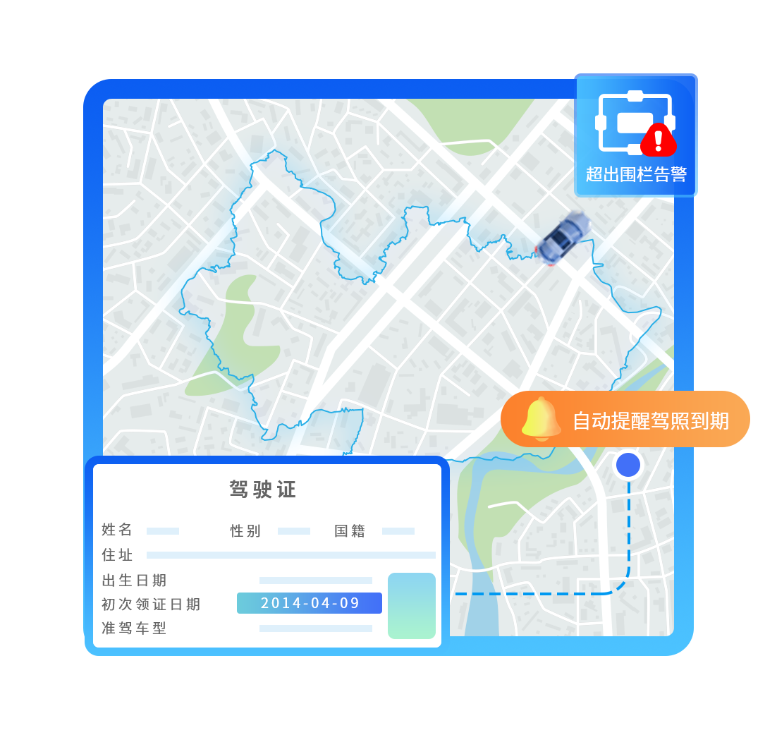 驾驶证/年检/保险/保养到期提醒,保障汽车合法运营超出围栏、超速、疲劳驾驶等告警,确保道路安全。