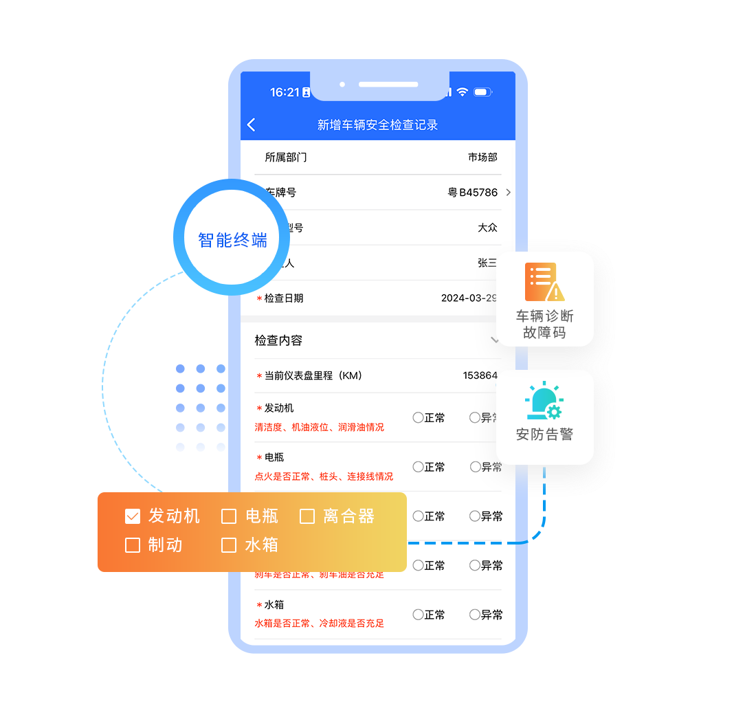 完善的汽车安全检查表,监督完成车辆定期“体检”智能终端实时车辆诊断故障码等安防告警。