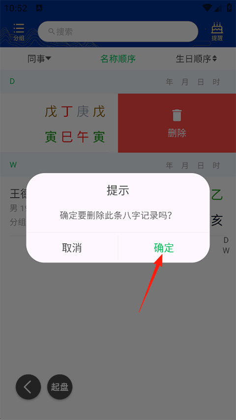 3、选中需要删除的八字信息记录左滑,点击删除;