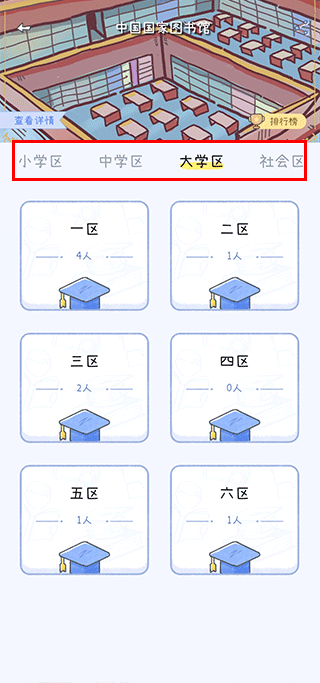 4、每一个图书馆内分为四个大区,小学区,中学区,大学区,社会区,选择适合的进入即可