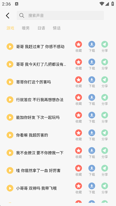 3、进入后平台支持收藏下载与分享语音包;