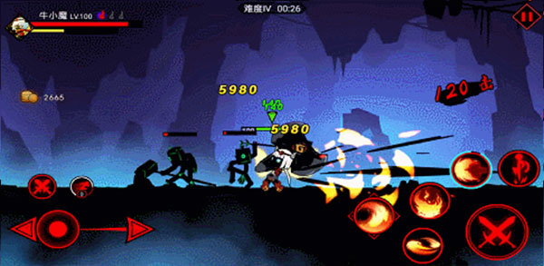Q技能-百八千回:牛小魔挥动八荒斧旋转进行攻击,并引动荒力进行火焰攻击,有30%概率触发战意,提升牛小魔攻击力