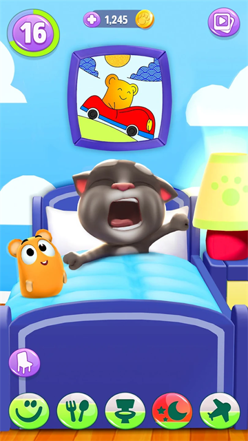 2、养育你专属的汤姆:和他玩游戏,喂他最喜欢的食物,带他上床睡觉。