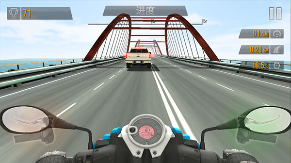 1、玩家在游戏中以第一人称驾驶摩托车在公路上驰骋,同时辅以重力感应控制,玩家只需通过晃动手机来实现摩托车的转向。在游戏的左下角和右下角分别有一个刹车键和加速键,玩家只需根据自己情况选择按哪一个按键。