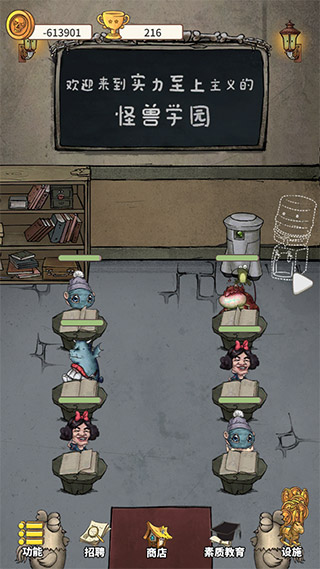 这款游戏叫《我的怪兽学园》,听起来有点奇怪但其实挺有趣的。它是个经营养成类的游戏,画风虽然有点暗沉,人物造型也不太好看,但玩法真的很新鲜。游戏的核心就是解锁各种教学设施来吸引怪兽们来学习,完成学业的怪兽会付给你金币,用这些钱你可以继续解锁新设施、招聘老师甚至研发新的课程公式。