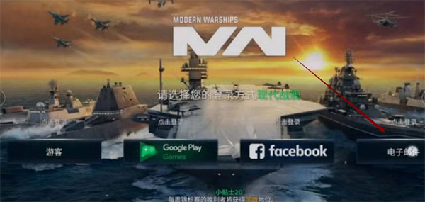 1、点击现代战舰:在线海战APP,进入游戏登录页面,可以看到有四个登录方式,这里以电子邮件登录为例,点击电子邮件登录。