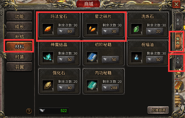 3、在商城用银两和元宝在材料里面可以买到