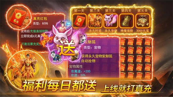 光速刷怪,四大福利开服赠送,狂战刀刀砍小怪。法师无限流星火雨,道士无限火符,召唤狐狸宝宝