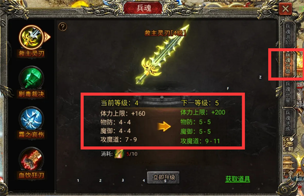 2、兵魂升级:这个升级的等级越高加的属性也越高,还是很值得提升一下的