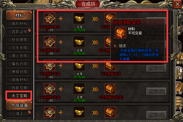 1、合成中增加了开工宝箱,里面可以用天工碎片金牛和元宝兑换成熔炼+1,+2,+3级别的金牛装备和金牛【炎】装备
