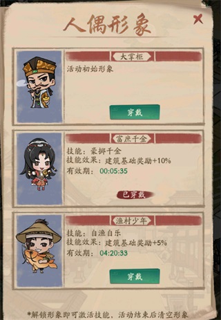穿戴不同的人偶形象可以带来不同的建筑基础奖励加成,而且人偶效果可叠加。希望能快速赚取更多金币的掌柜不要忽略这个点哦~