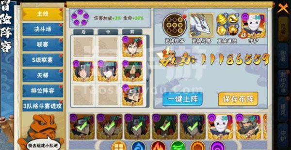 然后站位的话,第一套就是鸣人佐助站第一排、小樱站中间、最后一排站雏田和迪达拉。第二套就是自来也站第一排、鸣人佐助第二排、最后一排站小樱和红莲,保证后排辅助能够使用技能回复前排忍者的血量,达到忍者们伤害输出最大化。