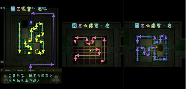 4、石像房间:包括两个将军石像和四个圣兽石像,都是用来开路的,优先解决这里面的踩石板机关。有石板的区域就是无暗雷区,可以放心踩。但是里头的小房间和塌陷神秘区域还是有暗雷的,要注意。石板还是老规矩踩亮不走回头路,在这附上图给大家参考。【PS:不是一定要从入口开始踩和结束,可以从任意的地方开始踩,往回走一步就可以全盘重置,所以完全可以从单独的一个分支从头踩起。】