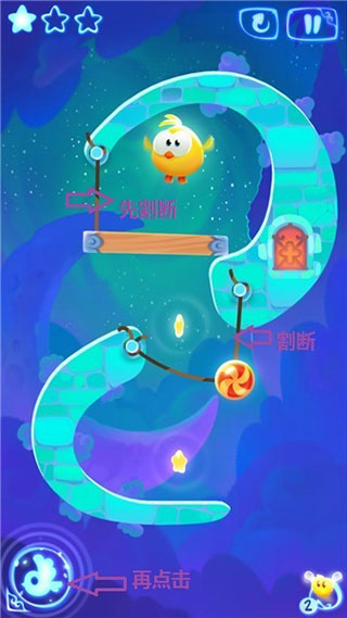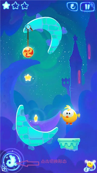 按图片箭头指示先割断最上方的绳子获得下方的两颗星星,再更换主角形态。