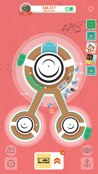 游戏有几个特色:可以在不同海域穿梭,探索未知的地方;在捕鱼过程中还能发家致富,升级小船到超级豪华游艇;除了普通的小鱼,还有机会挑战捕捉传说中的神秘大鱼。玩法也很轻松,没事的时候可以自动钓鱼,无聊的时候刷鱼群或捞金币箱子,提升钓场等级后还能更容易赚钱。