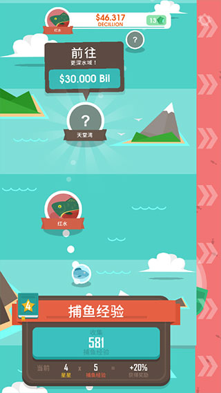 收集到一定量的金币时就可以换钓场了。提升钓场等级的话,鱼的价格也会提升,就更容易存钱了。