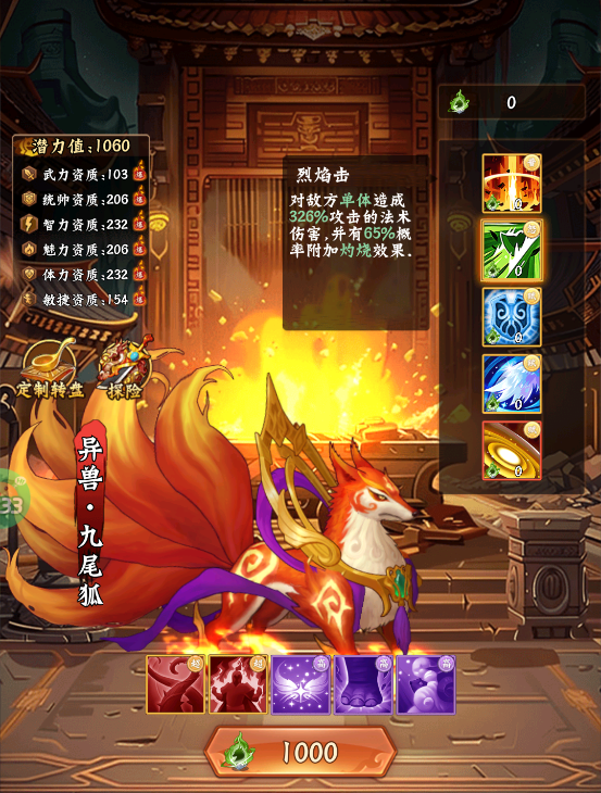 主动技能:【烈焰击】对敌方单体造成326%攻击的法术伤害,并有65%概率附加灼烧效果