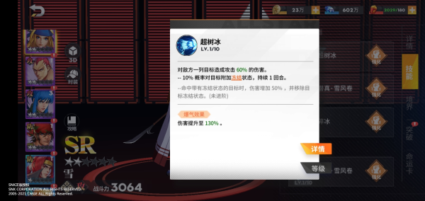 1.普攻——超树冰:该技能一经释放,能够对敌方的整列目标造成一定伤害,并有10%的概率附加“冻结”效果,持续一回合。冻结效果会令携带者无法行动并跳过该回合,并受到生命上限10%的直接伤害。