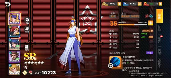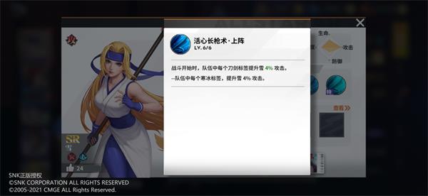 4.特质——活心长枪术:雪的特质与其流派名称相同,在战斗开始时队伍中带有【刀剑】标签的伙伴将为雪提升一定的攻击。格斗家达到4星后,队伍中带有【寒冰】标签的格斗家都将为雪提升4%的攻击。