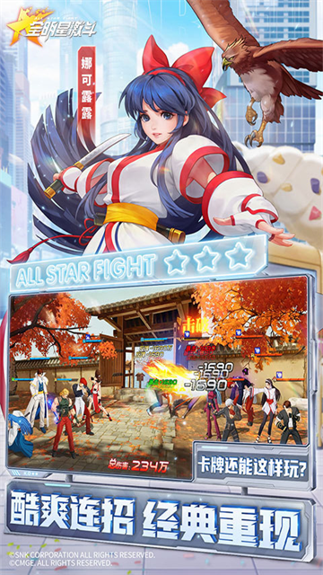 SNK系列格斗IP正版授权,超时空格斗家随心集结。在这里,草薙京和八神庵并肩作战,不知火舞和娜可露露超时空合作,全新的格斗冒险全权交由你来演绎。格斗,我全都要!