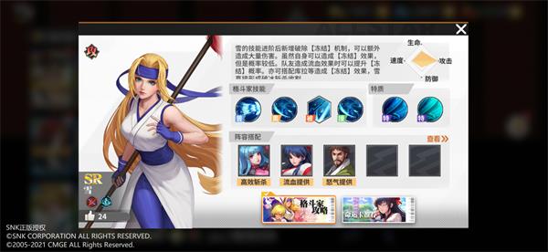 雪的攻击能力较为强劲,速度和生命值都中规中矩,而防御力较弱。这一类格斗家适合在队伍中充当输出的主力,并站位于后排稳定打击。
