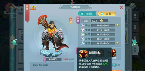 阵容方面在55前其实比较随意。55之前培养龙女即可。猪八戒和其他抽到的SS用用就行了,不必花精力培养。我只推荐55后的阵容。
