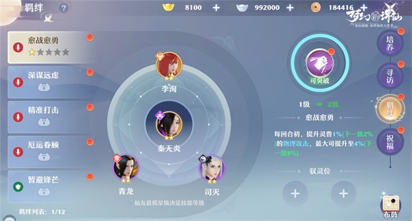 在达到52级时,道友将解锁全新仙友羁绊系统,集齐羁绊关联仙友即可手动激活【驭灵技能】赋予灵兽额外技能,提升灵兽整体实力。
