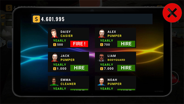 也许你想试试,但想要靠一个人应付加油站不断拓展的生意几乎是不可能的。这个时候,你需要聘请雇员了。你可以选择雇佣若干个雇员来帮助你经营加油站。雇员拥有不同的技能对应不同的任务,随着他们不断完成指定的任务,他们会变得越来越得心应手。