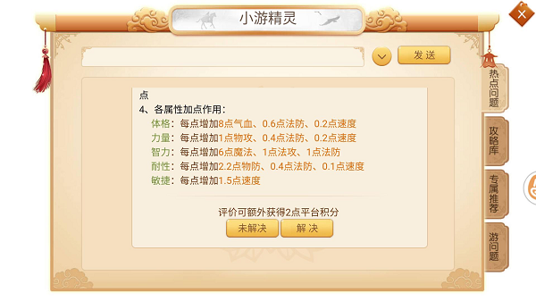 1点敏捷=1.5速度,1点体格=8气血+0.6法防+0.2速度,1点力量=1物攻+0.4法防+0.2速度,1点耐性=2.2物防+0.4法防+0.2速度