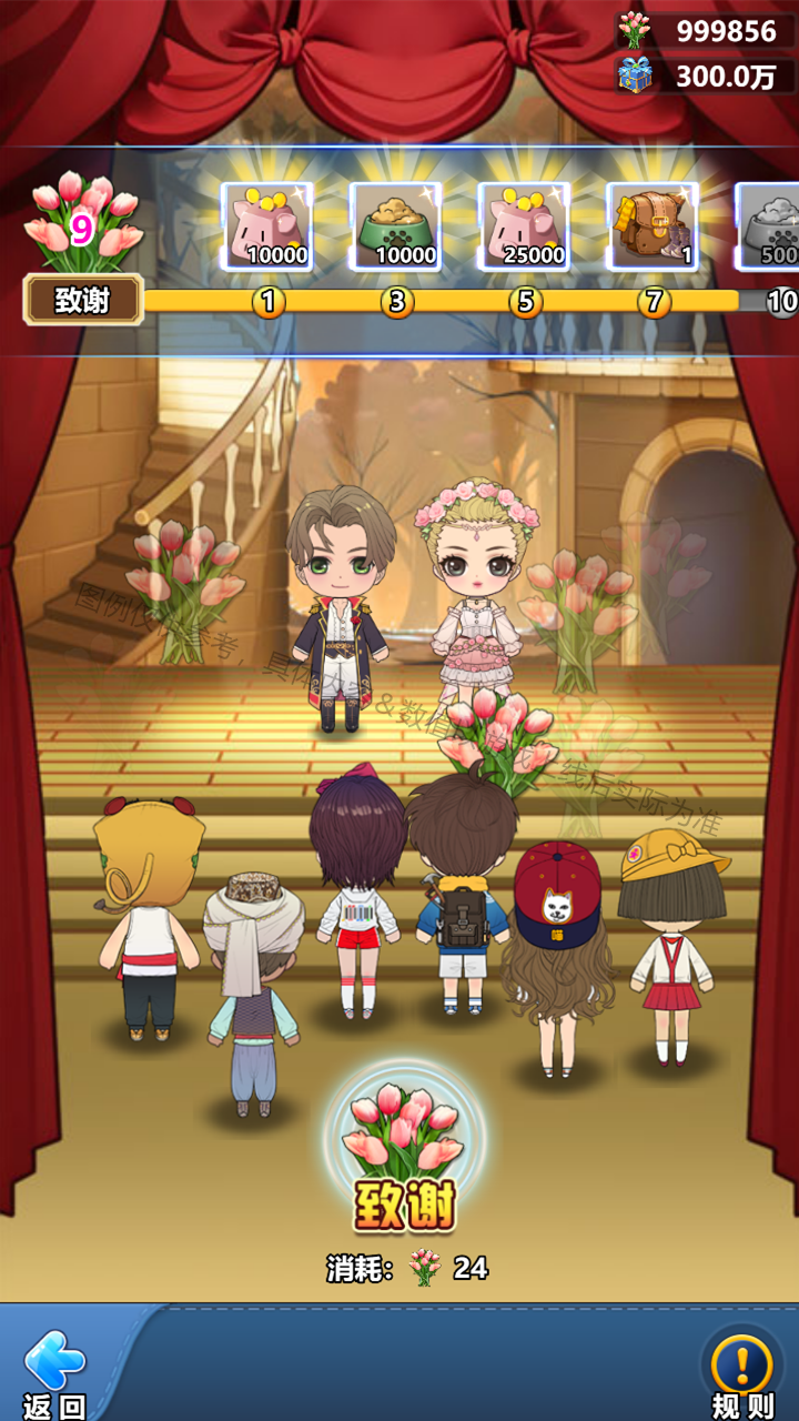 1. 致谢:正赛和展示期间,均可使用“花束”进行致谢。达到不同的致谢次数,可对应领取零花钱、宠物粮食、旅行包、“古堡密盒”等不同奖励。