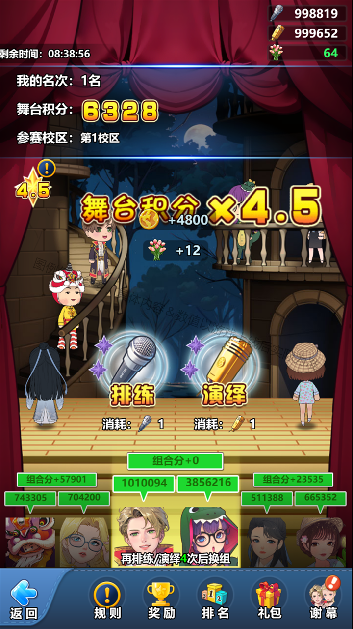 1) 排练:每次排练需消耗“银话筒”,可获得一定数量的比赛积分、世界币和“花束”;